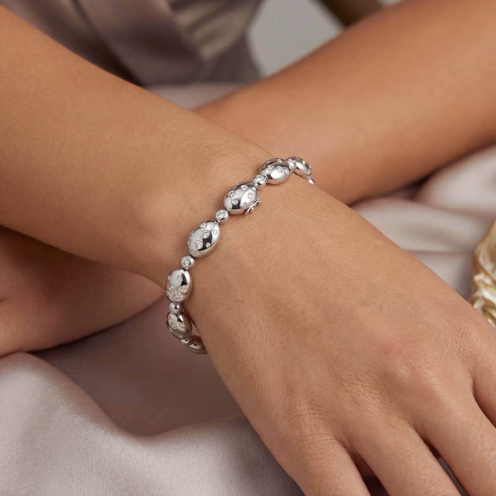 Ausdrucksstarker Armschmuck mit fein weißen Diamanten im runden Brillantschliff. Ganz zart und wie zufällig gestreut sind die edlen Brillanten in hochwertig gearbeitetem Weißgold 750/- gefasst. Alle Elemente sind beweglich gearbeitet und der Verschluss dezent verborgen.