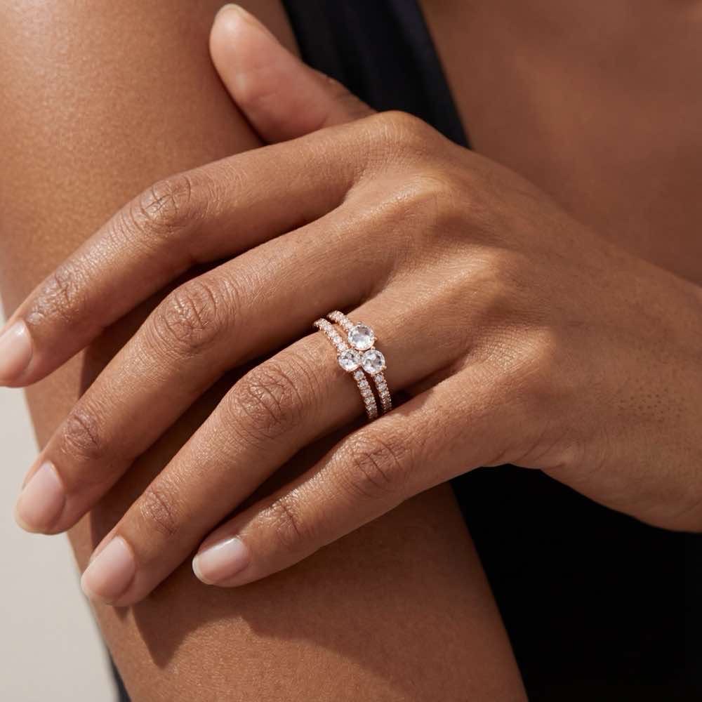 Frecher und zugleich stilvoller Ring mit dem gewissen Etwas. Mit weißen Diamanten in gemischten Schlifformen: auf dem Ring in Form von drei Rosenschliffen, entlang der Ringschienen mit Brillantschliffen. Aus 18-karätigem Roségold gefertigt.