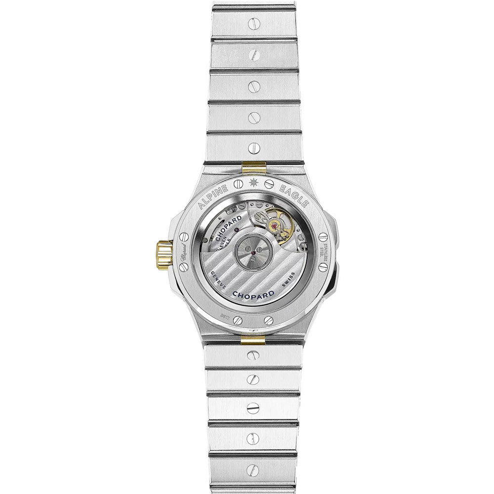 Chopard Alpine Eagle XS in 33 Millimeter Durchmesser, Zifferblatt "Valsgrau" mit Diamanten, Saphirglasboden. Chronometer zertifiziert (COSC), Automatik. Edelstahl und 18 Karat Gelbgold. Lünette mit Diamanten.