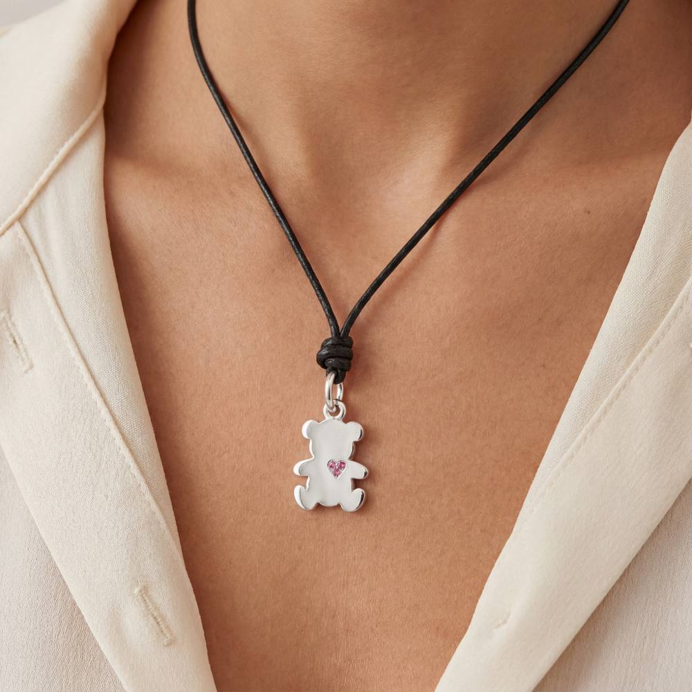 Bärchen-Anhänger mit einem Herz, gefüllt mit Rubinen. Gefertigt aus 750er Weißgold. Mit der Kollektion Bärenherz unterstützen Sie Kinder und Familien in Not. Preis inklusive Lederschnur.