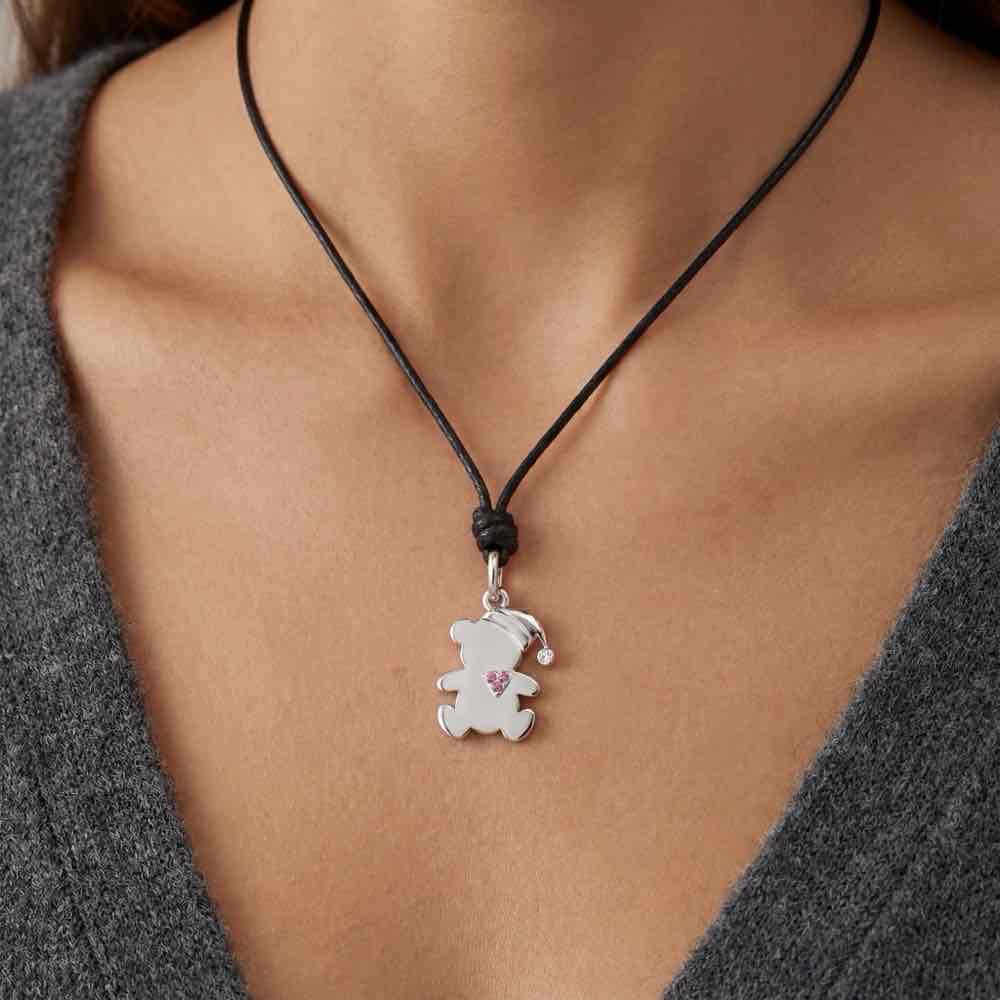 Bärchen-Anhänger mit diamantbesetzter Zipfelmütze und einem Herz aus Rubinen. Gefertigt aus Weißgold 750/-. Mit der Kollektion Bärenherz helfen Sie schwerstkranken Kindern und ihren Familien. Preis inklusive Lederschnur.
