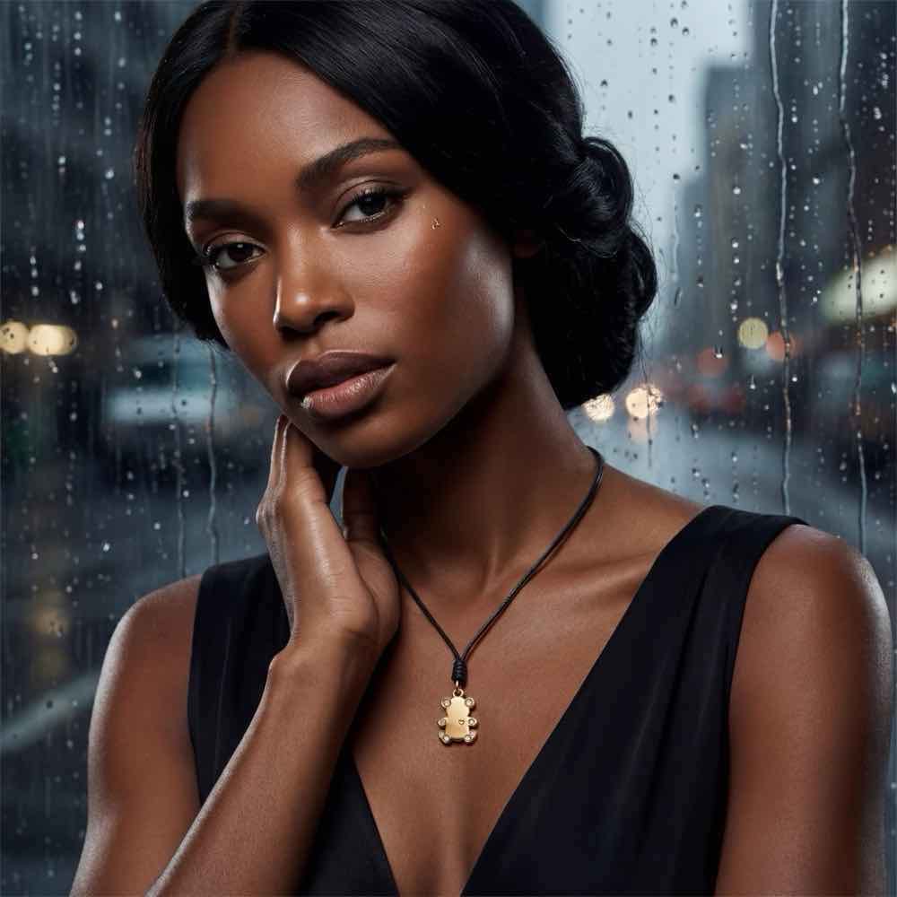 Bärchen-Anhänger mit braunen Diamanten und einem gravierten Herz auf der Brust. Gefertigt aus Gelbgold 750/-. Preis inklusive geknoteter, stufenlos längenverstellbarer Lederschnur.