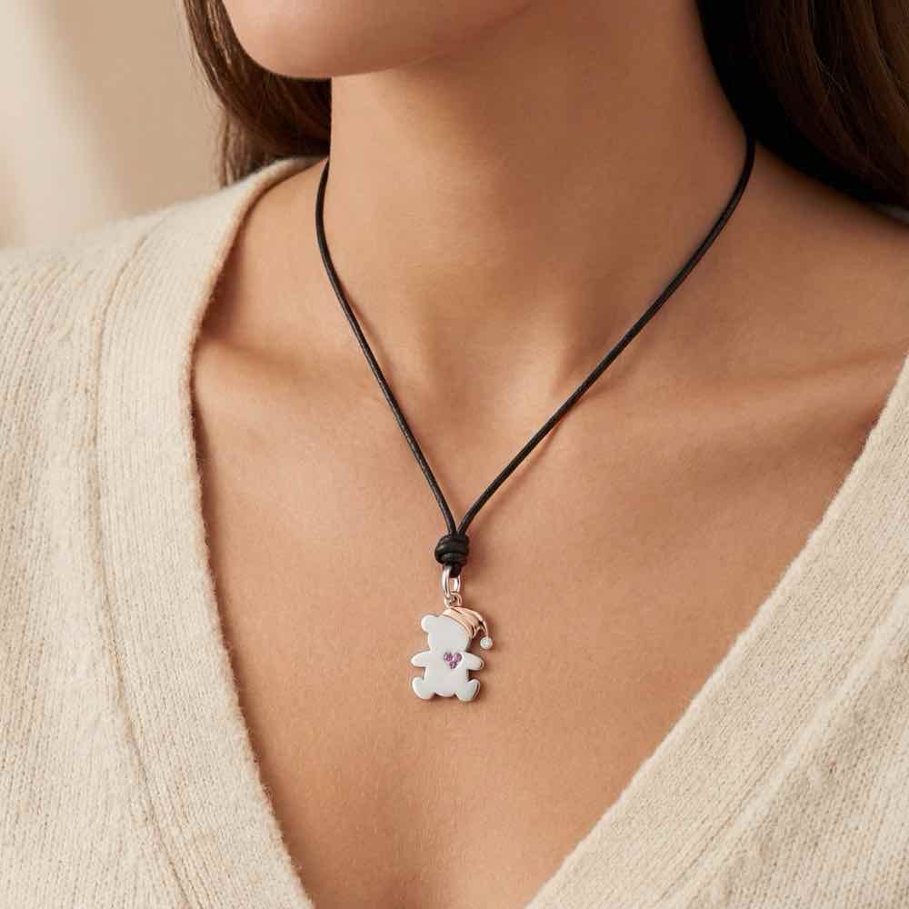 Bärchen-Anhänger mit diamantbesetzter Zipfelmütze und einem Herz aus Rubinen. Gefertigt aus Weiß- und Roségold 750/-. Mit der Kollektion Bärenherz helfen Sie Kindern und Familien in Not. Preis inklusive Lederschnur.