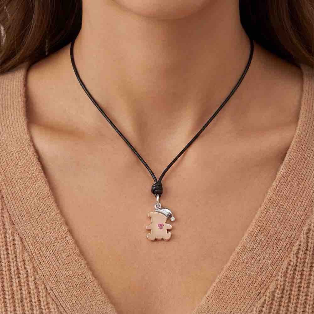 Bärchen-Anhänger mit diamantbesetzter Zipfelmütze und einem Herz aus Rubinen. Gefertigt aus Weiß- und Roségold 750/-.  Mit der Kollektion Bärenherz helfen Sie schwerstkranken Kindern und ihren Familien. Preis inklusive Lederschnur.