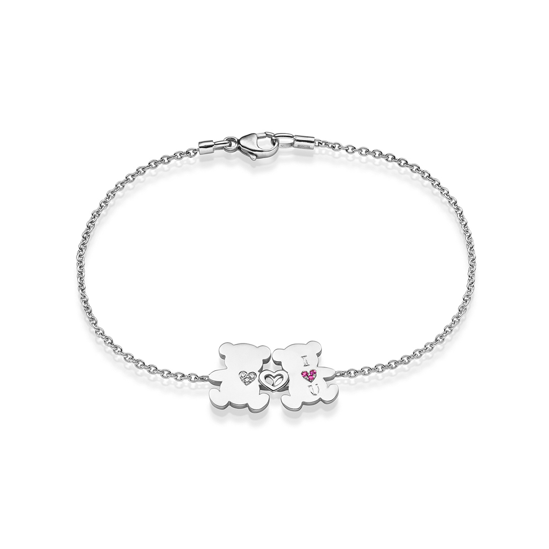 Armband mit zwei Bärchen, die sich gemeinsam an den Händen halten. Mit 3 Diamanten und 3 Rubinen. Gefertigt aus Weißgold 750/-. Mit der Kollektion Bärenherz helfen Sie Kindern und Familien in Not.