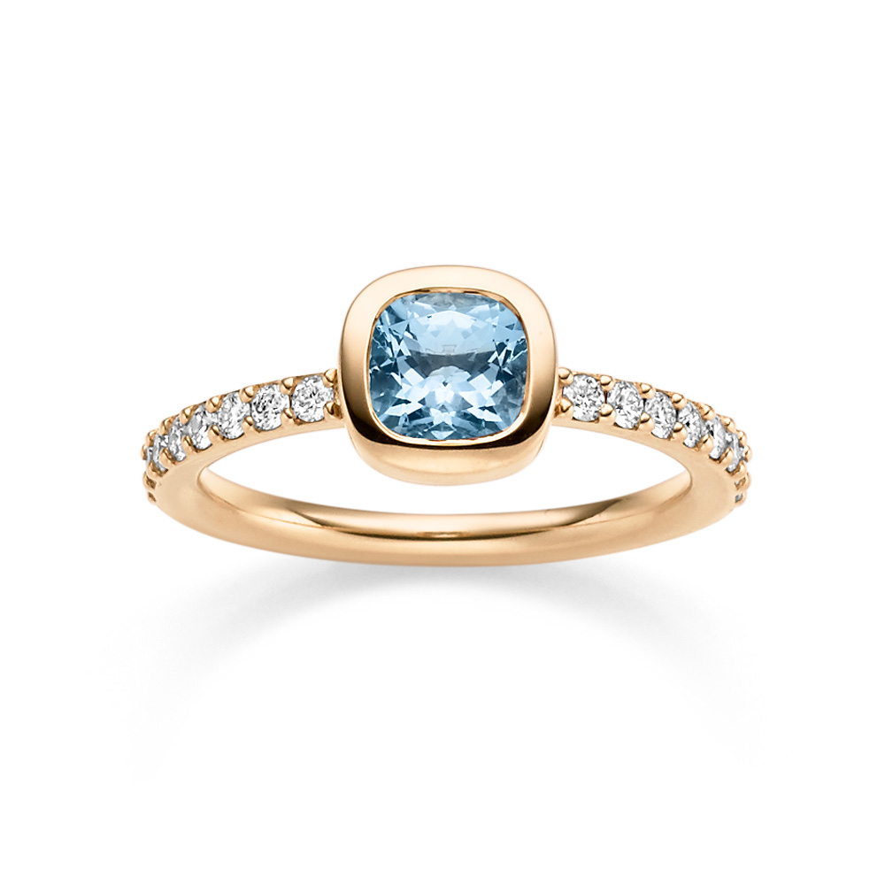 Charmanter Ring mit einem hellblauen Aquamarin im Kissenschliff, der in warmem Roségold eingefasst ist. Mit weißen Diamanten veredelt und in feiner Atelier-Handarbeit aus 18-karätigem Roségold gearbeitet.