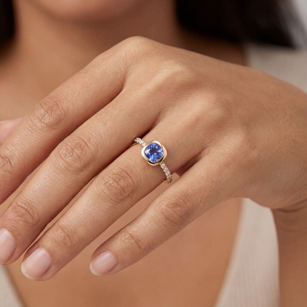 Charmanter Ring mit einem blau-violetten Tansanit im Kissenschliff, der in warmem Roségold eingefasst ist. Mit weißen Diamanten veredelt und in feiner Atelier-Handarbeit aus 18-karätigem Roségold gearbeitet.