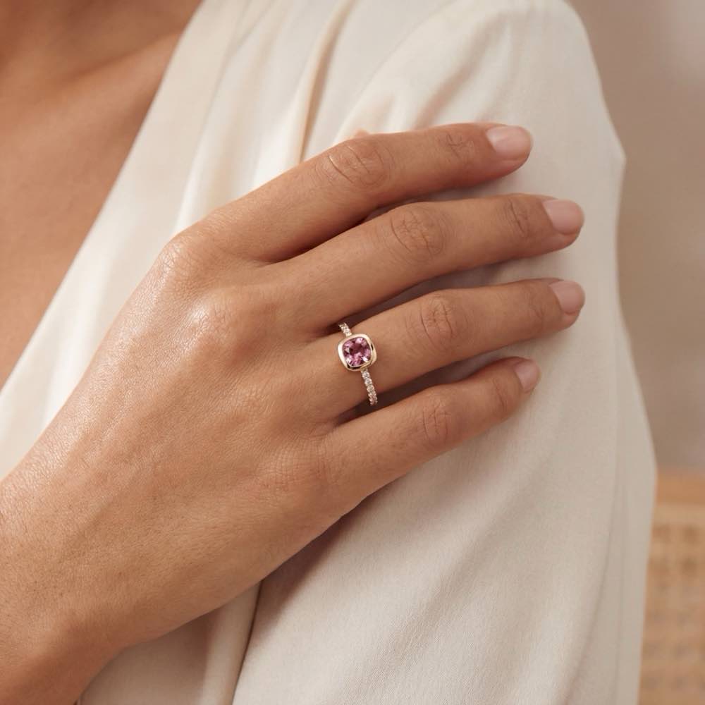 Charmanter Ring mit einem rosafarbenen Turmalin im Kissenschliff, der in warmem Roségold eingefasst ist. Mit weißen Diamanten veredelt und in feiner Atelier-Handarbeit aus 18-karätigem Roségold gearbeitet.