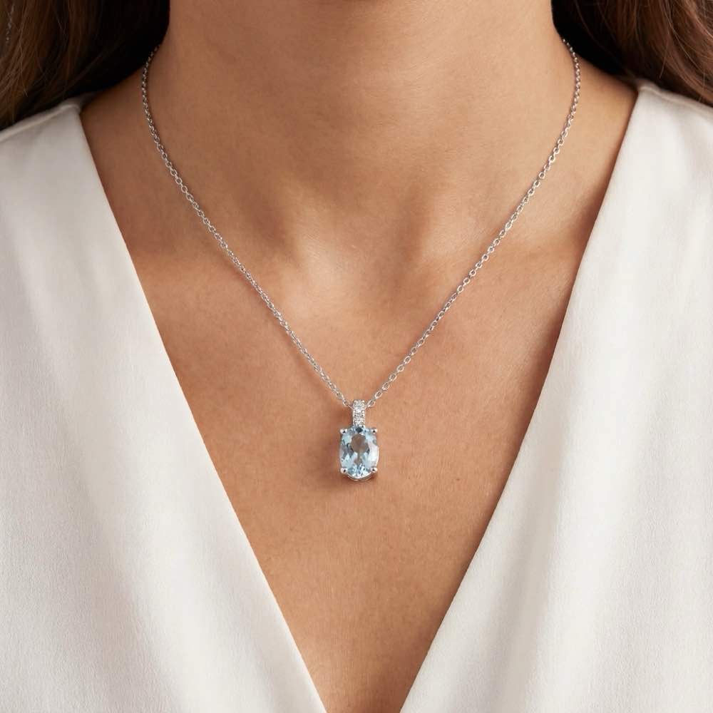 Zeitloser Anhänger mit Collierkette mit einem hellblauen Aquamarin und weißen Diamanten im Brillantschliff. In feiner Atelier-Handarbeit aus 18-karätigem Weißgold gearbeitet.