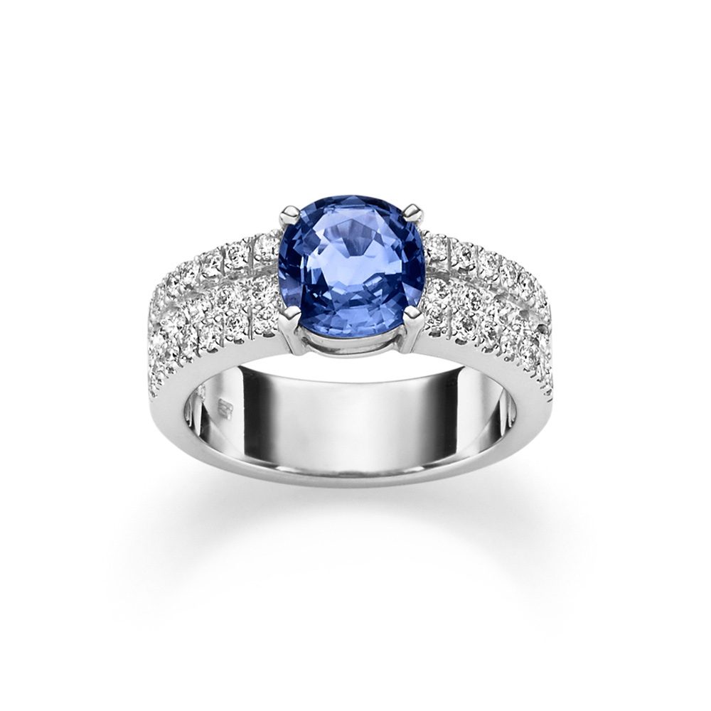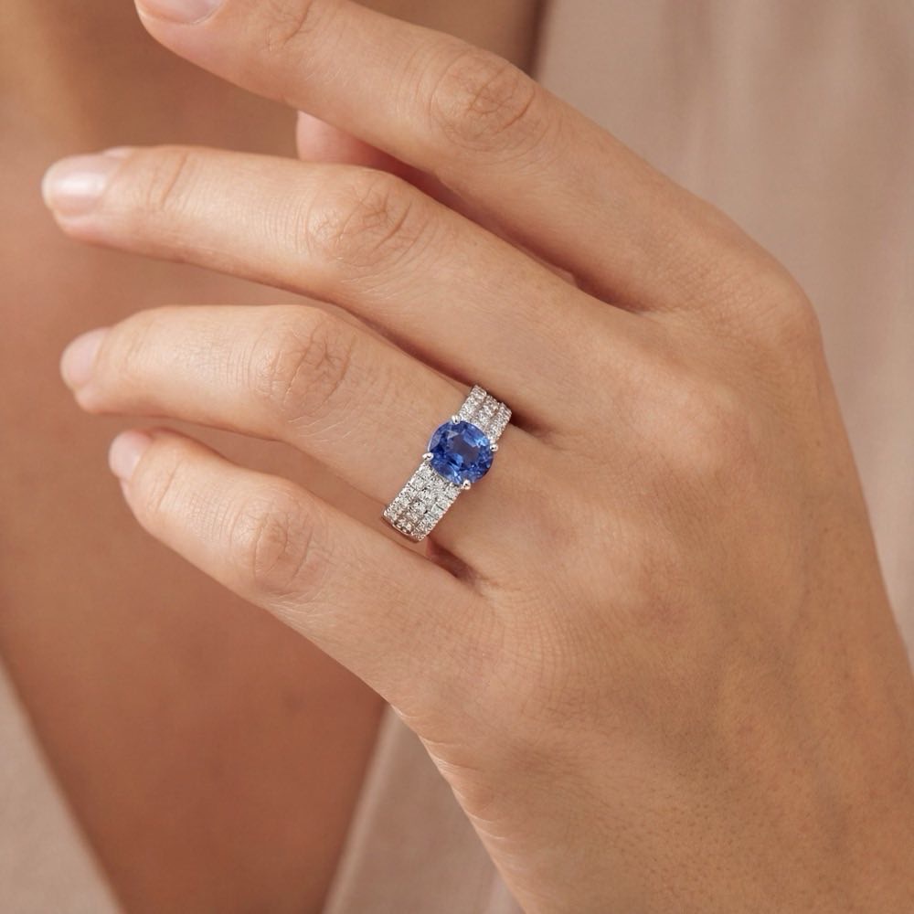 Wunderschöner Ring mit einem feinen blauen Saphir im Ovalschliff sowie weißen Diamanten. Gefertigt in feiner Atelier-Handarbeit aus Weißgold 750/-.
