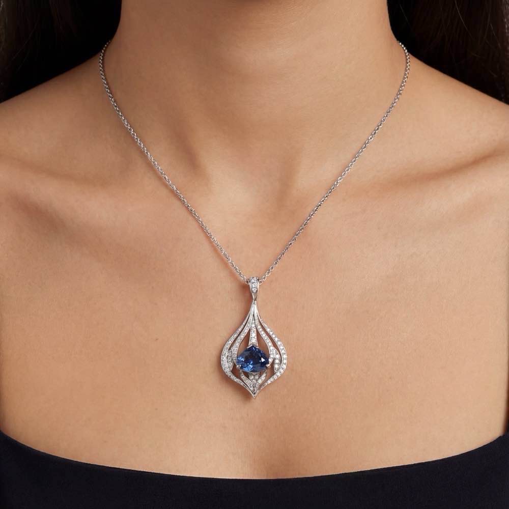 Anhänger mit einem stattlichen, blauen Saphir und weißen Diamanten. Gefertigt aus Weißgold 750/-.