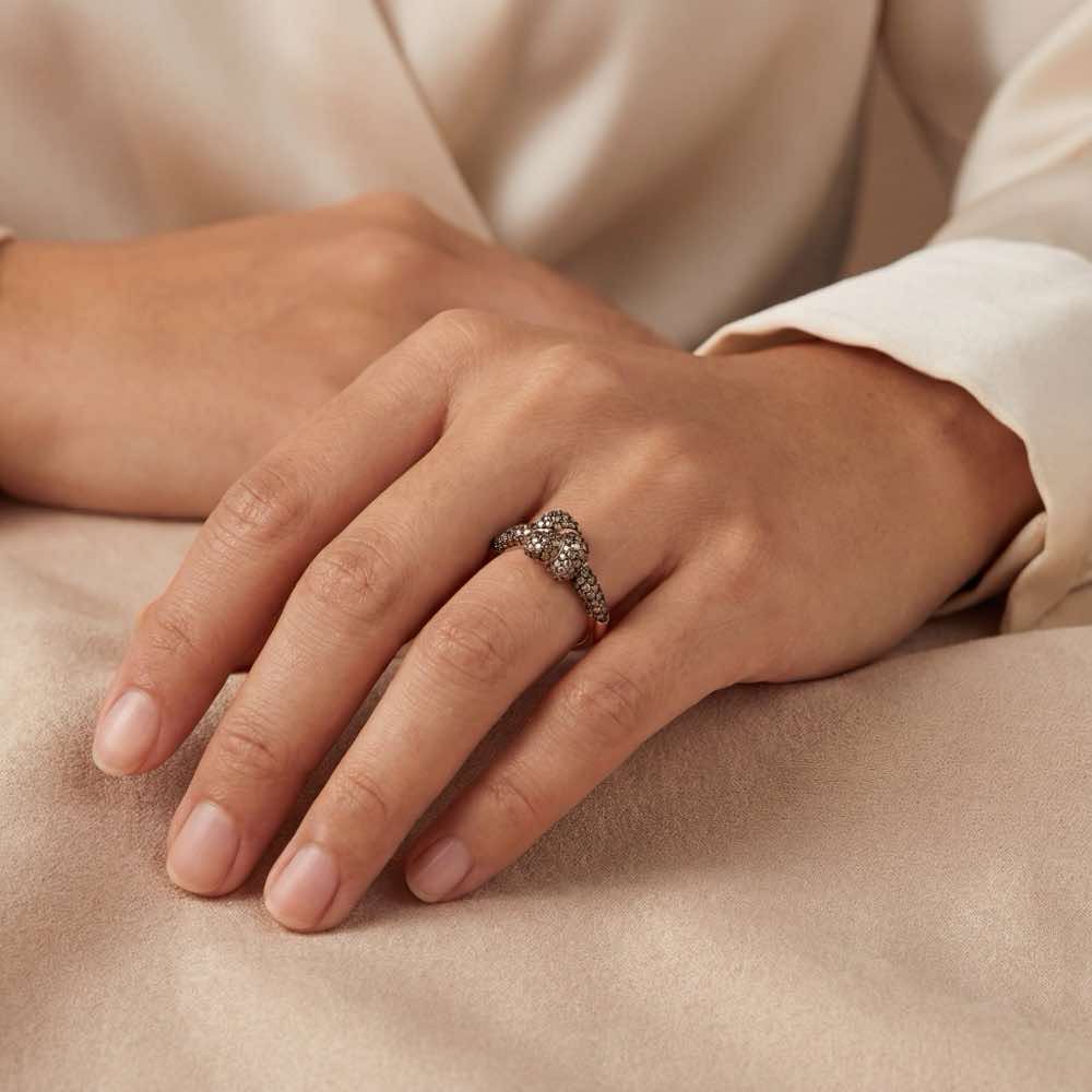 Raffinierter Eyecatcher: Ring mit Knotenmotiv mit braunen Brillanten, gearbeitet in Roségold 750/-.