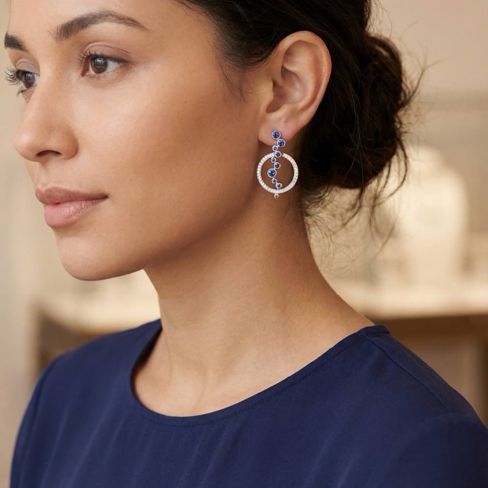 Ohrschmuck mit leuchtenden Saphiren und funkelnden Diamanten. Entworfen und gefertigt im Atelier Stoess.