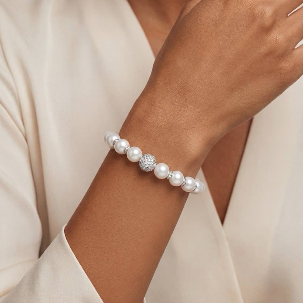 Flexible Armspange mit sanft schimmernden Südsee-Zuchtperlen und weißen Brillanten, zum Teil im Pavé-Setting. Gearbeitet in Weißgold 750/-.