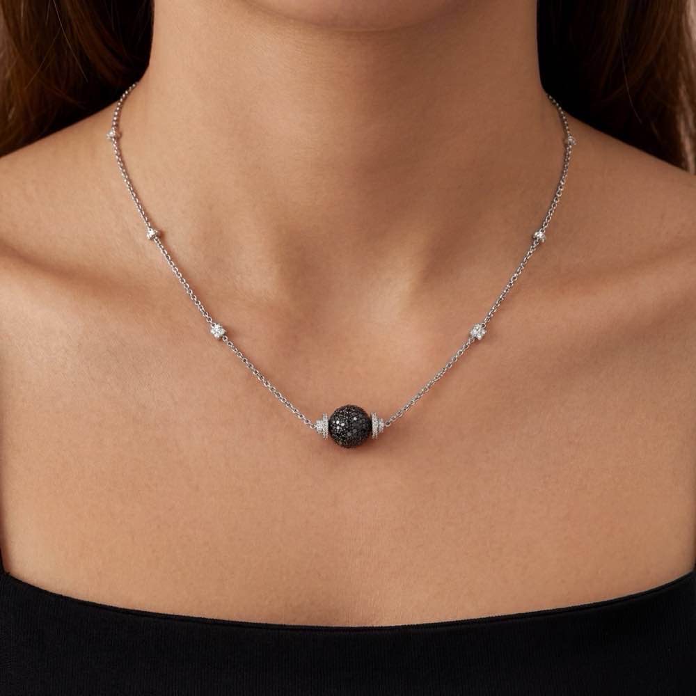 Dekorativer Halsschmuck mit weißen und schwarzen Diamanten und einer Kugel im Pavé-Setting. Gearbeitet in Weißgold 750/-.