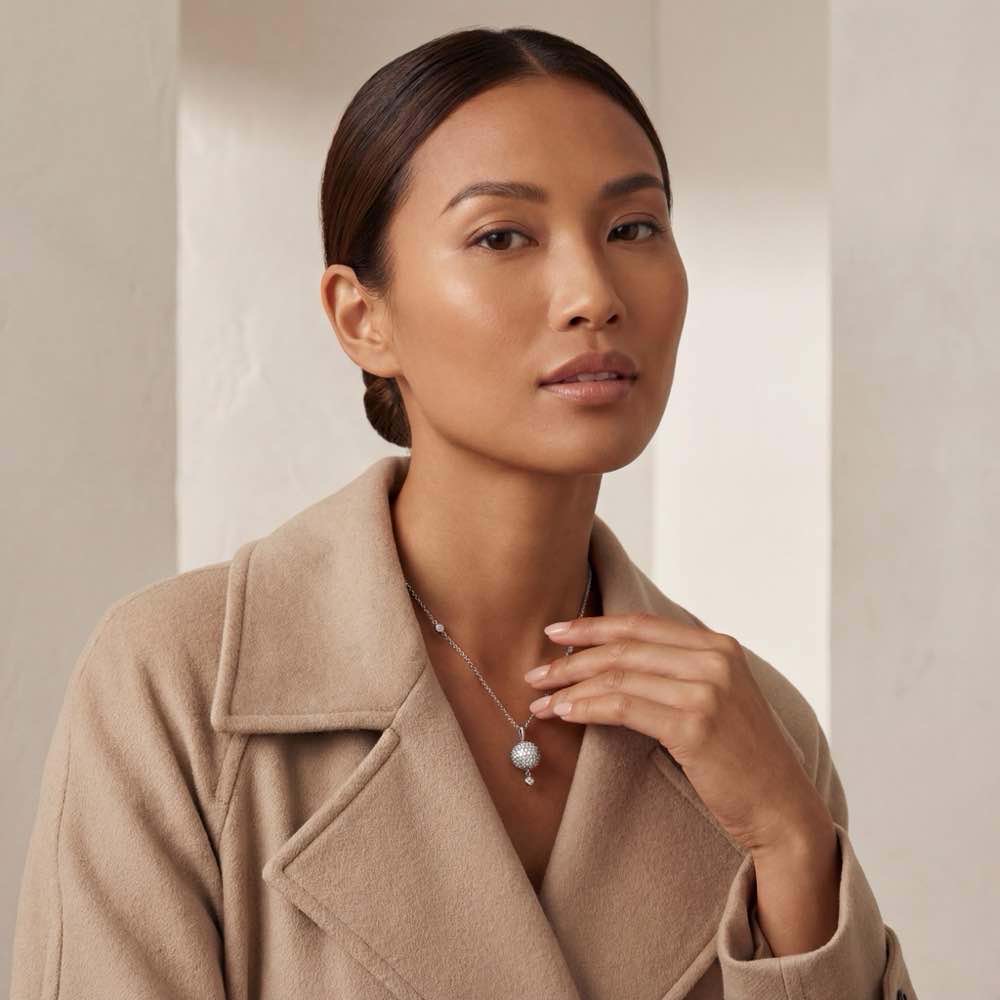 Dekorativer Halsschmuck mit einer vollständig mit Diamanten ausgefassten Kugel. Gearbeitet in Weißgold 750/-.