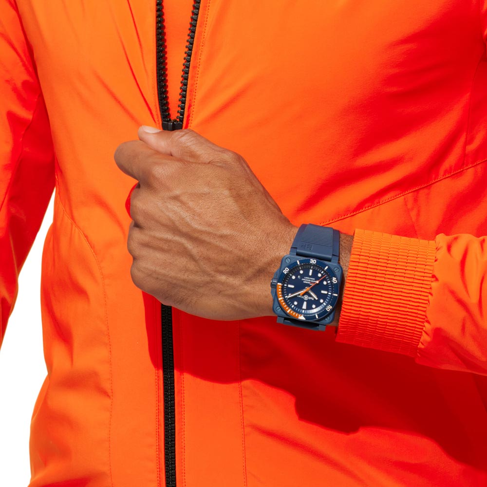 Diese auf 999 Exemplare limitierte Edition der bis 300 Meter wasserdichten Profi-Taucheruhr BR 03 Diver verfügt über ein mattblaues 42-mm-Keramikgehäuse mit einer einseitig drehbaren, blau-orangefarbenen Keramiklünette mit 60-Minuten-Teilung. Für eine perfekte Ablesbarkeit der Anzeigen ist das blaue Metallzifferblatt mit applizierten Indizes und einer weißen Skala mit Super-LumiNova®-Beschichtung versehen.