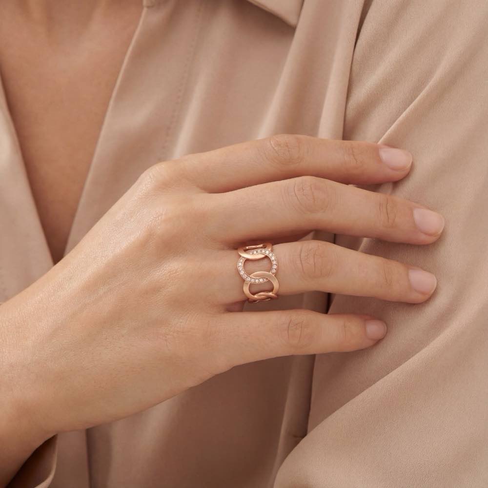 Stilvoller Ring von Pomellato aus der Kollektion Brera. Benannt nach dem schicken Stadtviertel  Mailands "Brera", verkörpert der Ring den italienischen Schick der italienischen Metropole. Aus 18 Karat Roségold mit zimtfarbenen Diamanten.