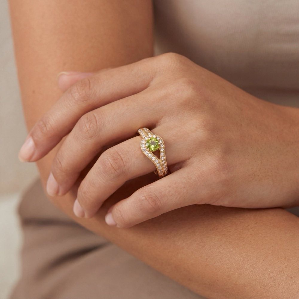 Außergewöhnlicher Ring mit schwungvollen Linien, besetzt mit einem lindgrünen Peridot und weißen Brillanten. Gearbeitet in Gelbgold  750/-.