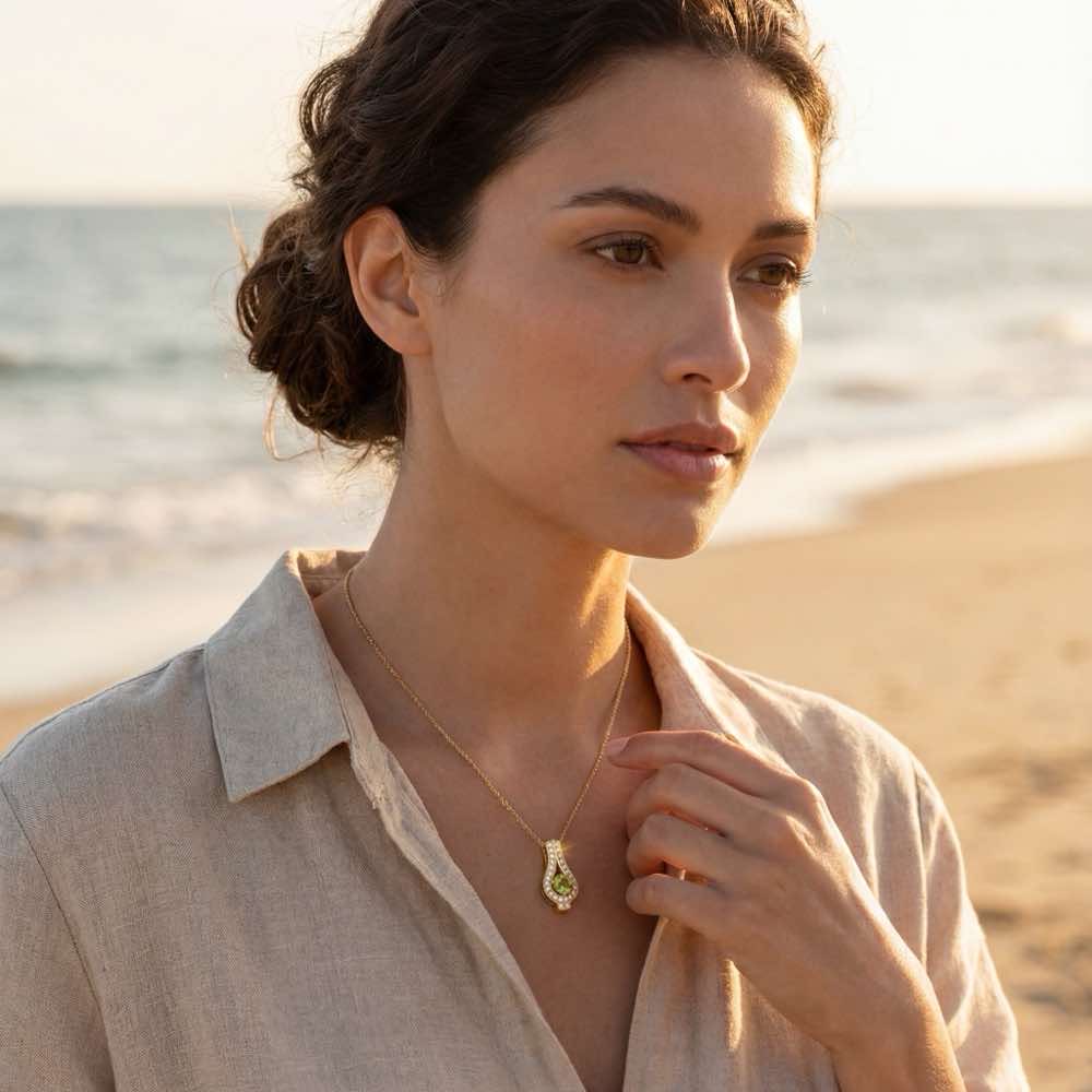 Schicker Anhänger mit einem lindgrünen Peridot und weißen Brillanten. Feines Collierkettchen im Ankermuster. Gearbeitet in Gelbgold 750/-. Preis zzgl. Kette.