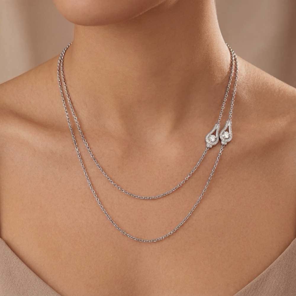 Elegante, zweireihige Sautoir-Kette mit zwei stattlichen Diamanten im Brillantschliff und weiteren Brillanten. Feine Collierkette im Ankermuster. Gearbeitet in Weißgold 750/-.
