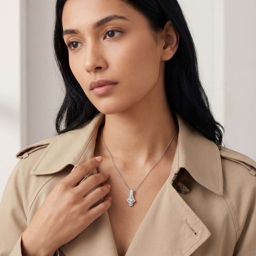 Schicker Anhänger mit einem stattlichen Diamanten im Prinzess-Schliff sowie weiteren weißen Brillanten. Feines Collierkettchen im Ankermuster. Gearbeitet in Weißgold 750/-.