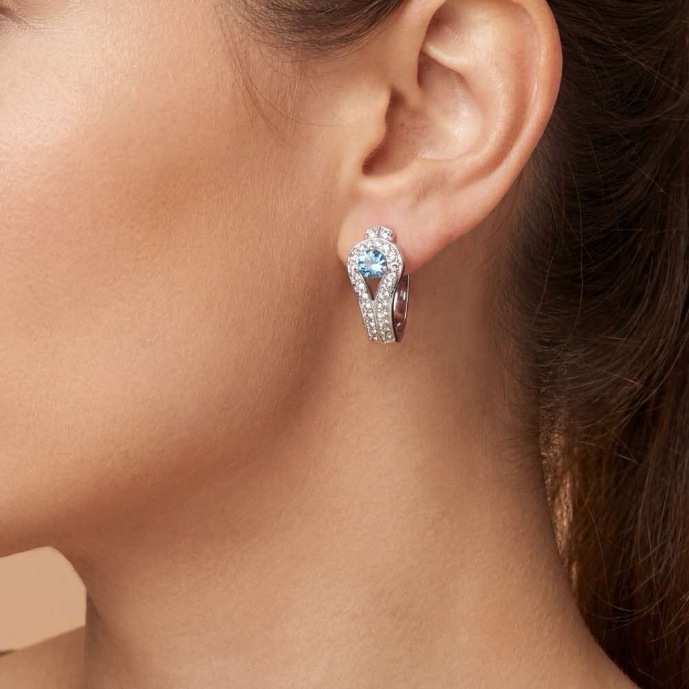 Schicker Ohrschmuck mit leuchtenden Blautopasen und weißen Brillanten. Durch die raffinierte Kombination von Clipmechanik zum Aufklappen und Ohrsteckern sitzt er perfekt am Ohr. Gearbeitet in Weißgold 750/-.