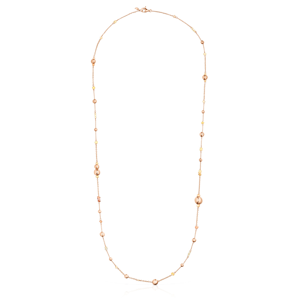 Sportlich-verspielte Collierkette  aus 18-karätigem Roségold in vielseitiger 80 Zentimeter Länge. Damit ist sie sowohl einreihig lang oder zweireihig kurz tragbar. Zarte Kugeln aus Roségold werden umspielt von Topasen im Bead-Schliff. Lässiger Luxus von Cervera!