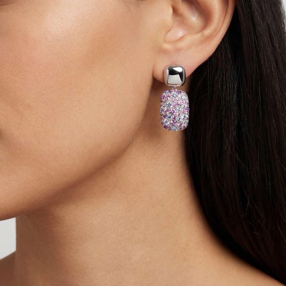 Farbenfrohe Ohrringe mit verschiedenfarbiegen Saphiren. Der Clou: das Oberteil lässt sich aushängen und als schlichter Ohrstecker tragen. Gearbeitet in feiner Handarbeit aus 18-karätigem Weißgold.