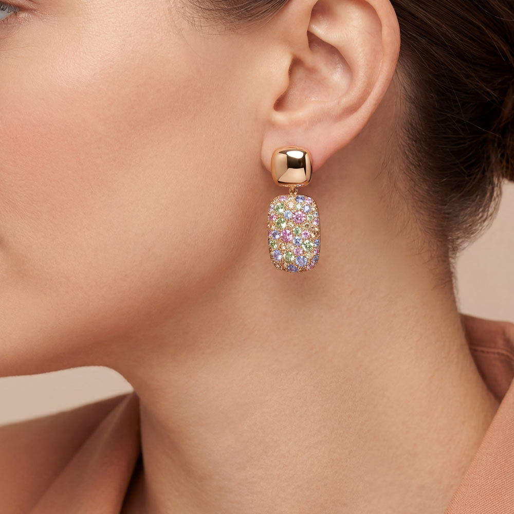 Farbenfrohe Ohrringe mit verschiedenfarbiegen Saphiren sowie braunen Diamanten. Der Clou: das Oberteil lässt sich aushängen und als schlichter Ohrstecker tragen. Gearbeitet in feiner Handarbeit aus 18-karätigem Roségold.