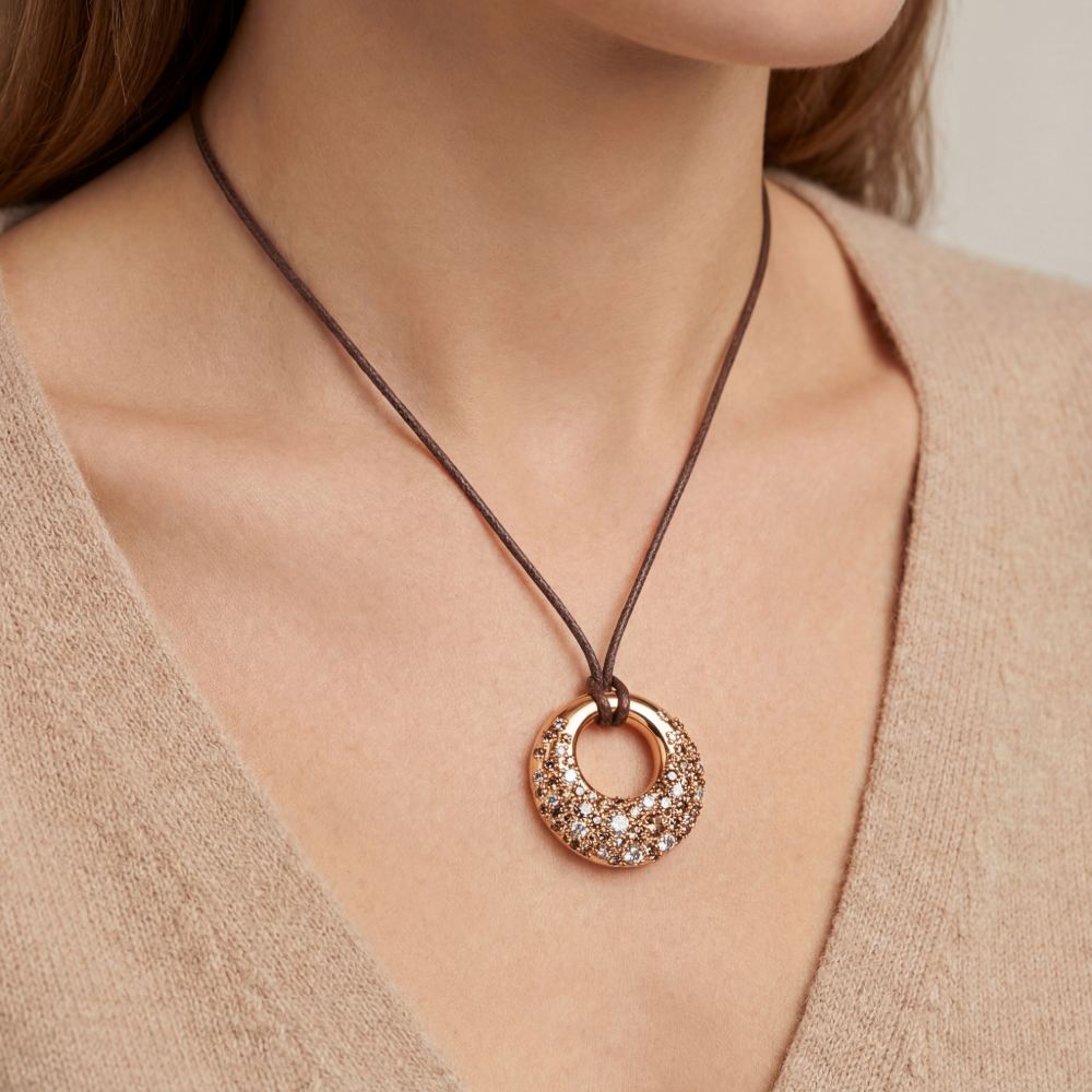 Charmanter Anhänger mit weißen und braunen Diamanten verschiedener Nuancen von über 1 Karat Gesamtgewicht. Gearbeitet in feiner Handarbeit aus 18-karätigem Roségold. Die abgebildete Schnur aus gewachster Baumwolle ist sehr langlebig und farbenfroh. Mit einer besonderen Schnürung ist sie verschlusslos zu tragen und zugleich in der Länge stufenlos einstellbar. Die Lederschnur ist ein Tragebeispiel und kann durch jede andere Kette ersetzt werden. Sprechen Sie uns gerne dazu an!