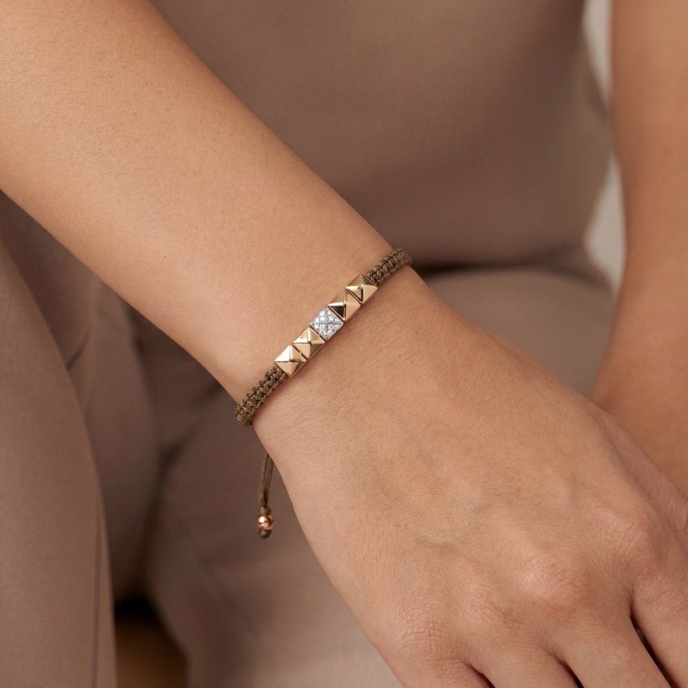 Lässiger Armschmuck aus einem Textil-Zugarmband und fünf aufgeschobenen Flachpyramiden aus Roségold 750/-. Mit fein weißen Brillanten ausgefasst lässt sich dieser Armschmuck in der Länge jederzeit leicht verstellen.