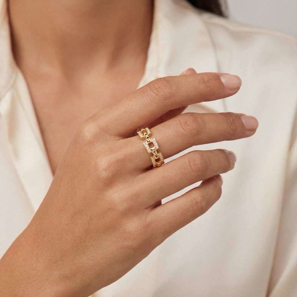 Extravagant geformter Ring aus sich wiederholenden Flachpyramiden, besetzt mit strahlend weißen Brillanten. In feiner Handarbeit massiv und wertvoll in Gelbgold 750/- gearbeitet.