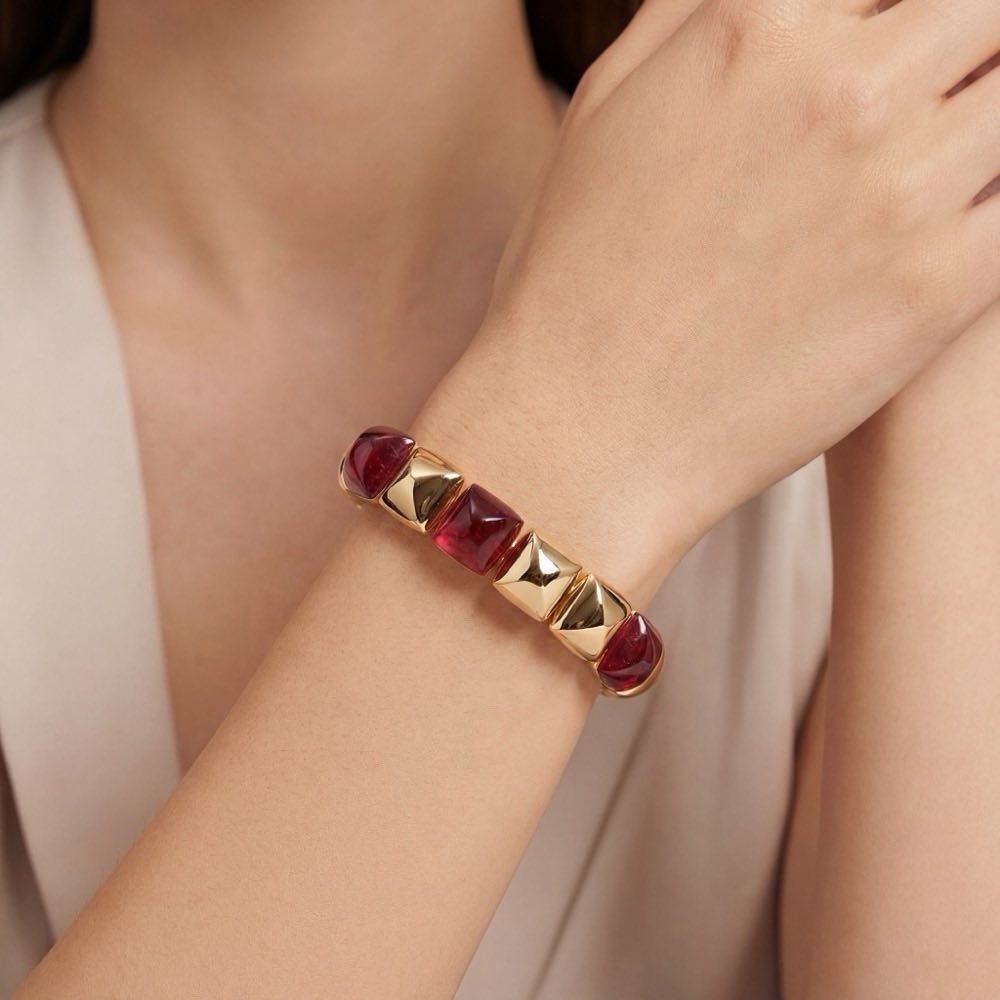 Formvollendete, moderne Amspange mit drei leuchtend roten Turmalinen im Pyramiden-Schliff. In feiner Handarbeit aus Roségold 750/- gearbeitet.