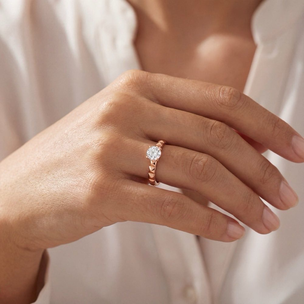 Extravaganter Solitärring aus sich wiederholenden Flachpyramiden, besetzt mit einem stattlichen weißen Brillanten. In feiner Handarbeit in Roségold 750/- gearbeitet.
