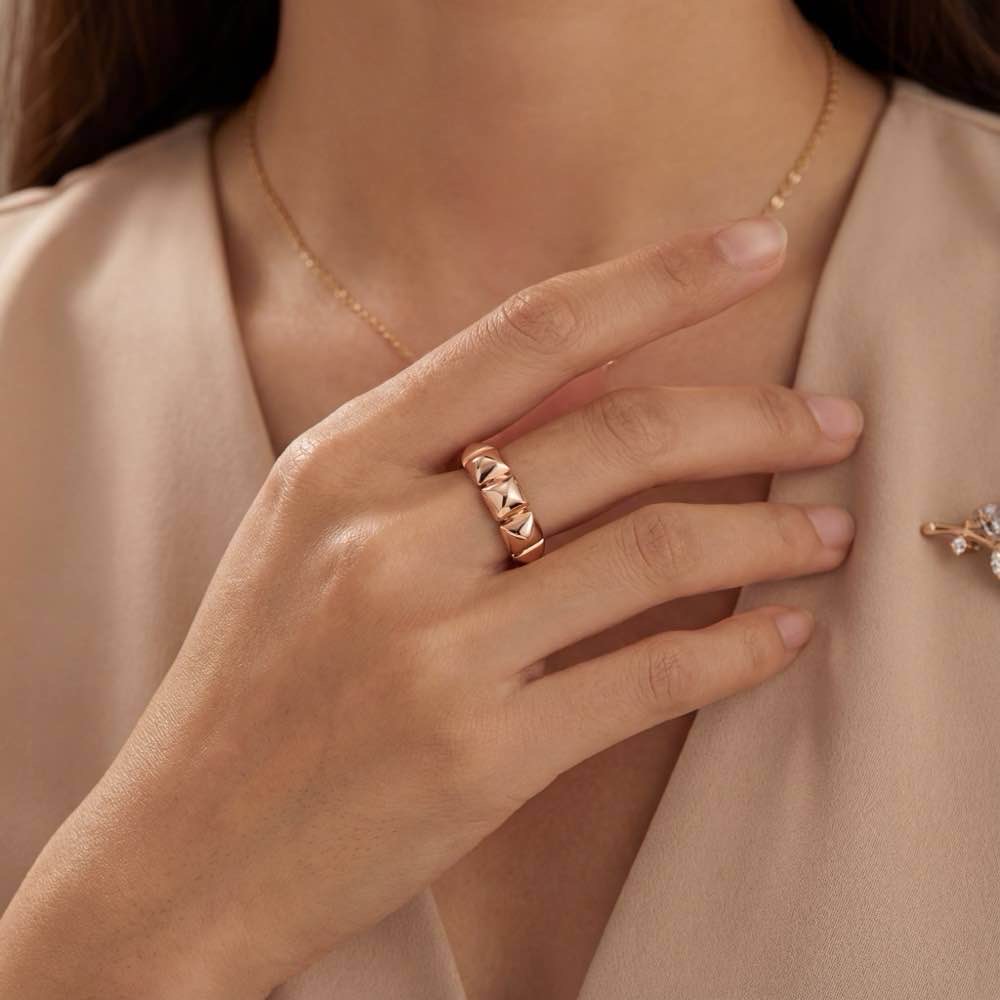 Sportlich-eleganter Ring aus sich wiederholenden Flachpyramiden. In feiner Handarbeit in Roségold 750/- gearbeitet.
