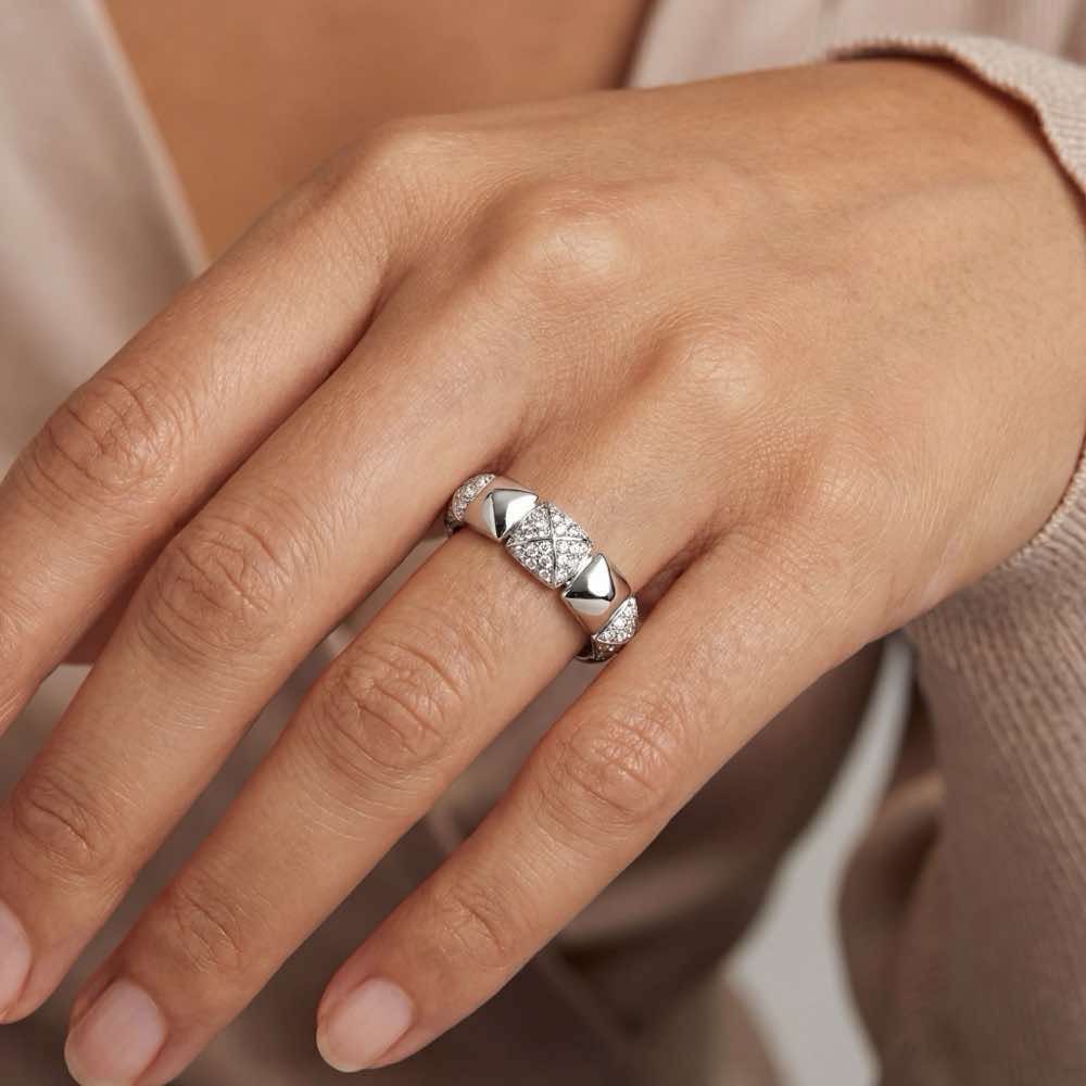 Sportlich-eleganter Ring aus sich wiederholenden Flachpyramiden, besetzt mit weißen Brillanten. In feiner Handarbeit in Weißgold 750/- gearbeitet.
