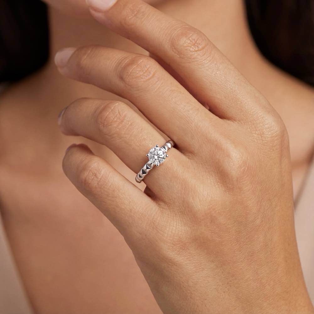 Extravaganter Solitärring aus sich wiederholenden Flachpyramiden, besetzt mit einem stattlichen weißen Brillanten. In feiner Handarbeit in Weißgold 750/- gearbeitet.