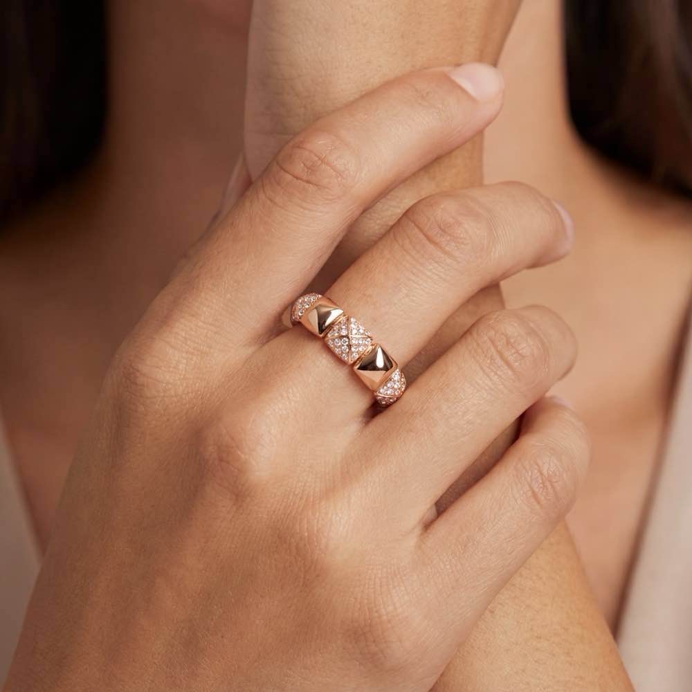 Sportlich-eleganter Ring aus sich wiederholenden Flachpyramiden, besetzt mit weißen Brillanten. In feiner Handarbeit in Roségold 750/- gearbeitet.