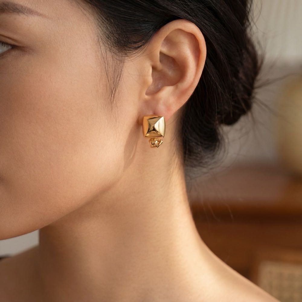 Sportlich-eleganter Ohrschmuck aus Flachpyramiden. Mit Clipmechanik und damit ohne Ohrlöcher tragbar. In feiner Handarbeit in Roségold 750/- gearbeitet.