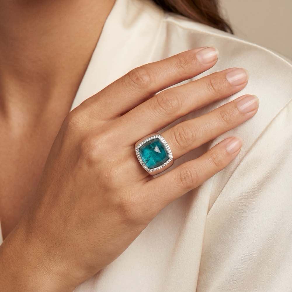 Formvollendetes Statement-Piece mit einem petrolfarbenen Turmalin im Pyramiden-Schliff und weißen Brillanten. In feiner Handarbeit aus Weißgold 750/- gearbeitet.