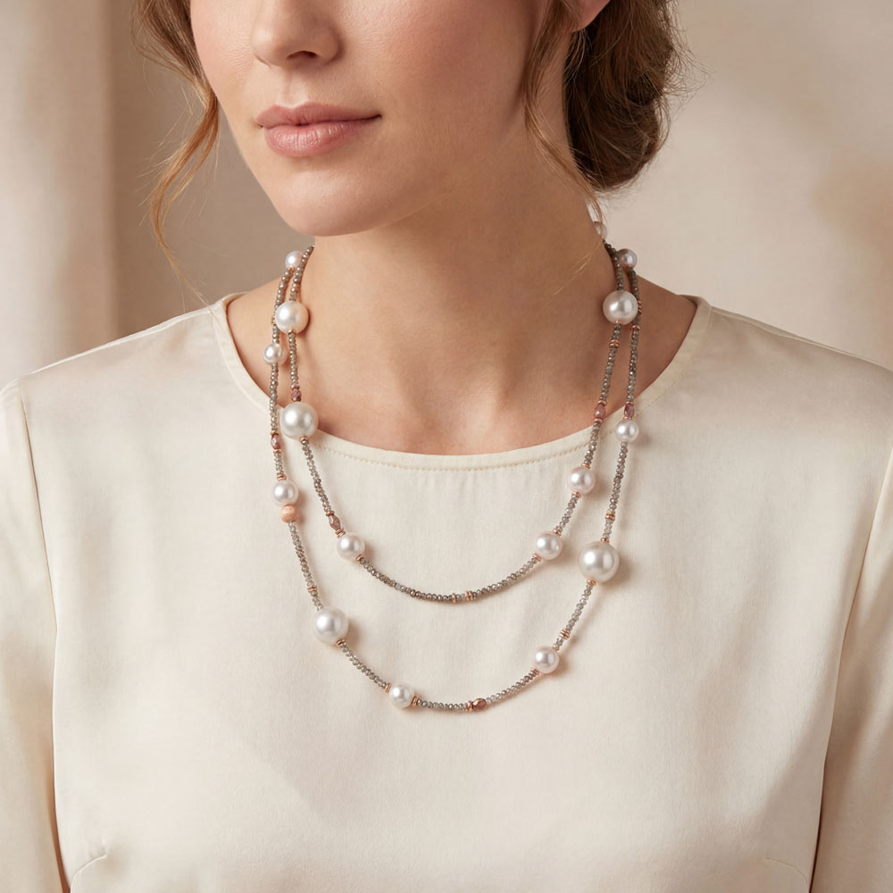 Das stilvolle Collier der Produktlinie Castaway brilliert durch seine wundervoll funkelnden braunen Diamanten im Rice- and Beadschliff gepaart mit einzigartigen weißen Akoya- und champagnerfarbenen Südsee-Zuchtperlen. Ein Must-have!