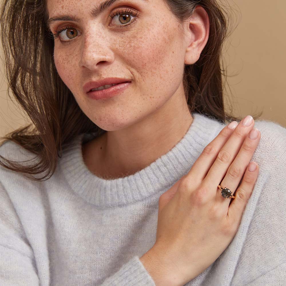 Ring Catch aus der Kollektion City Garden. Mit schwarzem Rutil Quarz im Briolett-Schliff wirkt der geliebter, cooler Ring besonders cool. Gefertigt aus Roségold 18 Karat.