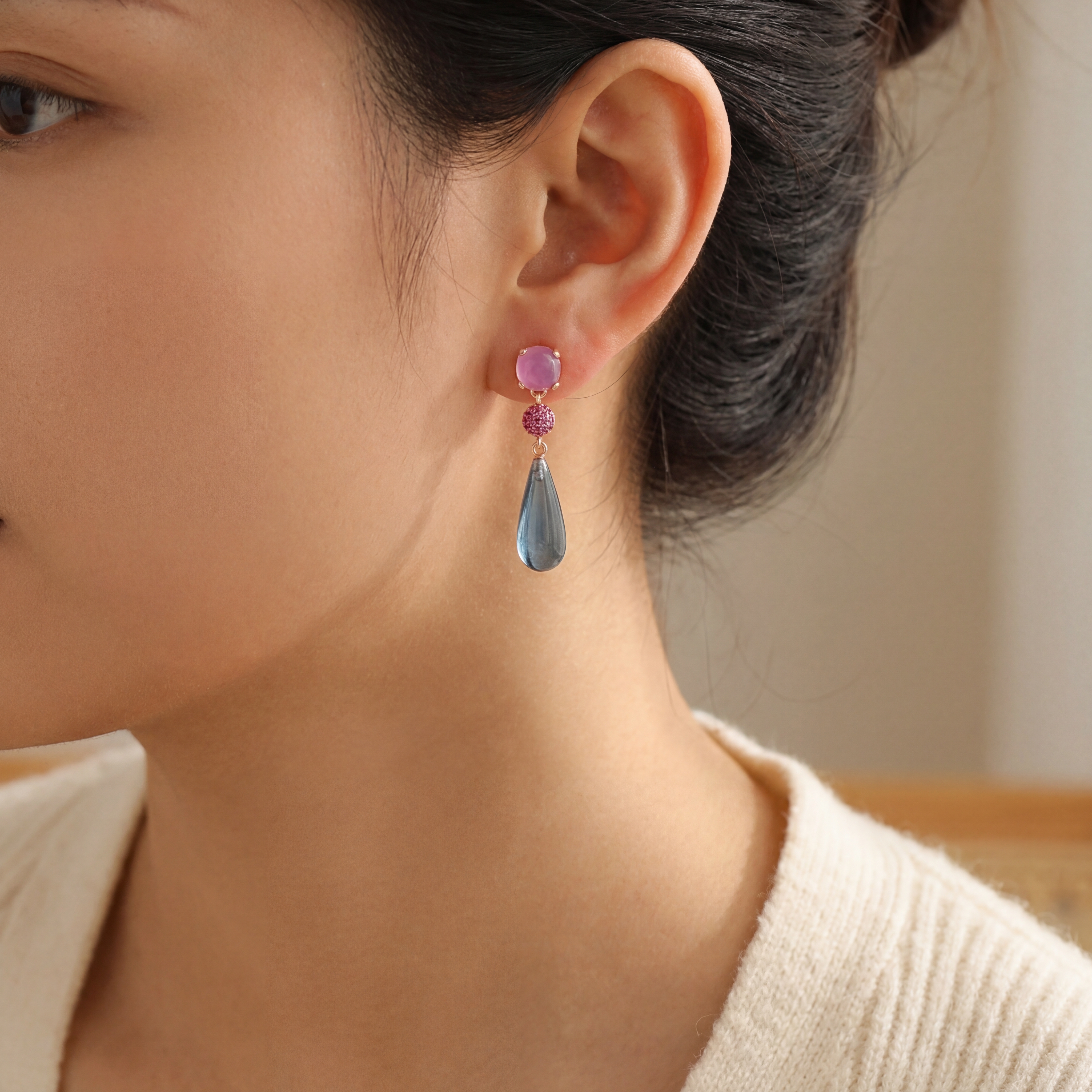 Ausgefallene Ohrringe mit Amethysten und Londontopasen im Cabochon-Schliff sowie rosa Saphiren im Brillantschliff. Gefertigt aus Roségold 18 Karat. Ein echter Blickfang!