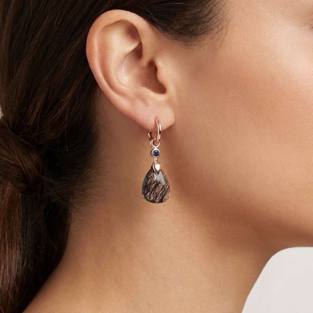 Ohrringe Catch aus der Kollektion City Garden. Ohrringe mit schwarzem Rutil Quarz im Briolett-Schliff und schwarzen Saphiren. Gefertigt aus Roségold 18 Karat.