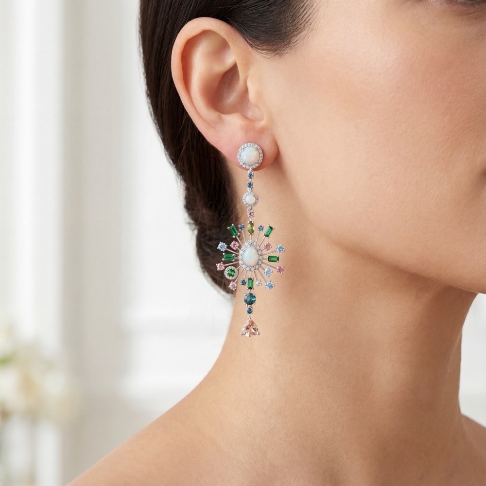 Charismatischer und kunstvoller Ohrschmuck aus der Kollektion Chandelier aus farbigen Edelsteinen, Jelly-Opal und weißen Diamanten. Vom visionären Geist der Renaissance in Florenz inspiriert. Der prachtvolle Farbenmix verbindet meisterhaft Form, Bewegung und Dynamik. Maximaler Tragekomfort und exzellente Haptik durch die hochwertige Fertigung jedes Einzelstücks.  Très chic!