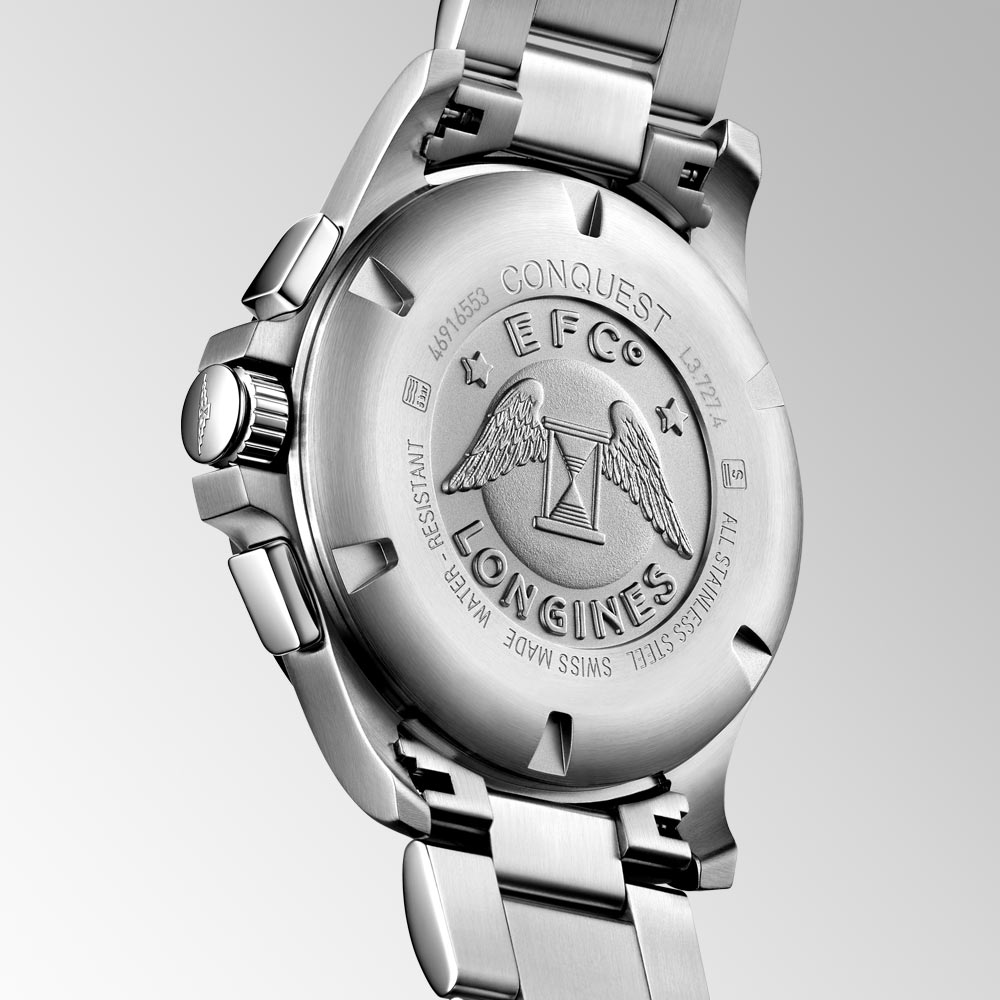 Die Longines Chronograph Performance Conquest vereint beeindruckende Präzision mit einer markanten, sportlich‑dynamischen Ästhetik. Das 44 mm große Edelstahlgehäuse verleiht der Uhr eine kraftvolle Präsenz, während das schwarze Carbon‑Zifferblatt mit seiner feinen Struktur für eine moderne technische Wirkung sorgt. Luminiszierende Zeiger und Indizes gewährleisten optimale Ablesbarkeit, geschützt durch kratzfestes, entspiegeltes Saphirglas. Im Inneren arbeitet das hochpräzise Quarzkaliber L289.2, das speziell für Chronographenmodelle der V.H.P.-Reihe entwickelt wurde. Es überzeugt mit einer außergewöhnlichen Genauigkeit und integriert moderne Technologien wie das Gear Position Detection System, Magnetfeld‑ und Schockkorrektur sowie einen praktischen ewigen Kalender für das Datum. Ergänzend dazu bietet die Uhr eine Chronographenfunktion mit drei Totalisatoren sowie ein Datumsfenster zwischen 4 und 5 Uhr. Ein robustes Edelstahlband mit Sicherheitsschließe rundet die sportliche Ausstrahlung harmonisch ab und sorgt für einen zuverlässigen Sitz am Handgelenk. Mit einer Wasserdichtigkeit von 50 Metern ist die Chronograph Performance Conquest ein verlässlicher Begleiter für den Alltag und vereint moderne Technologie, Präzision und zeitgemäßes Design in perfekter Balance.
