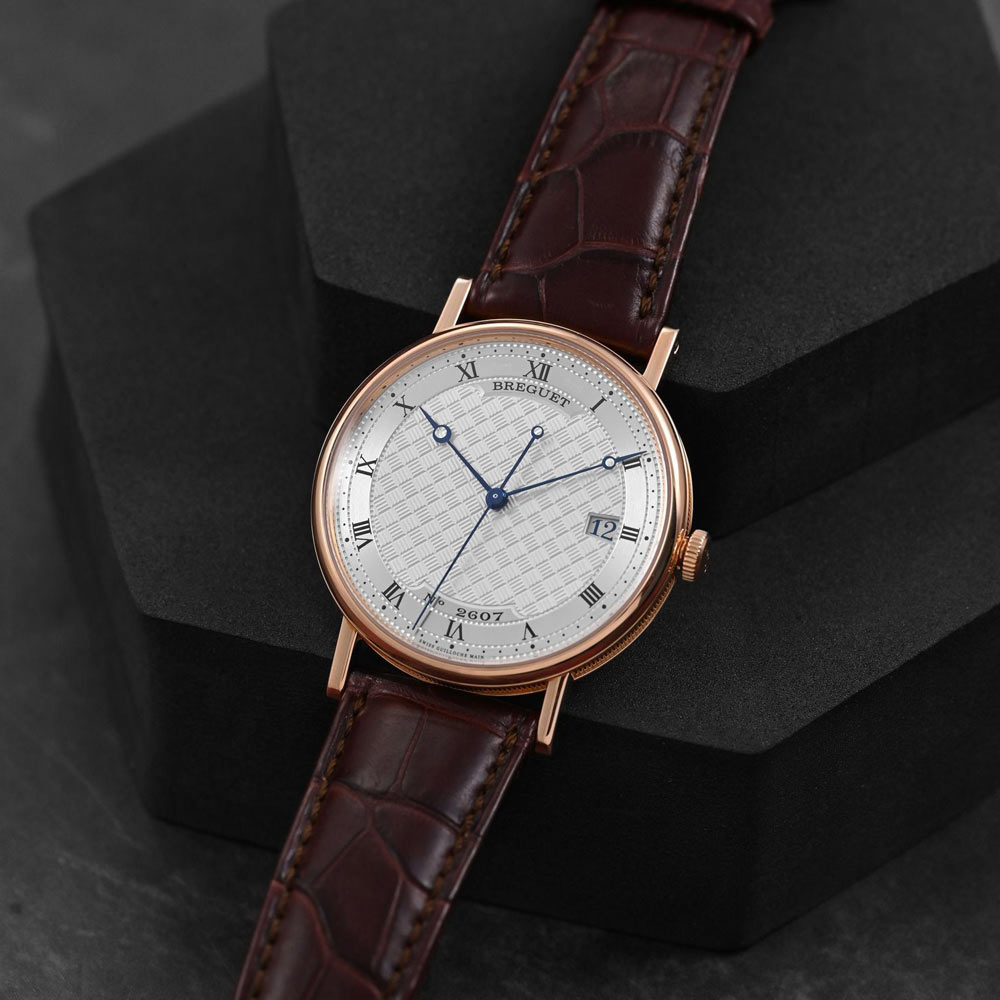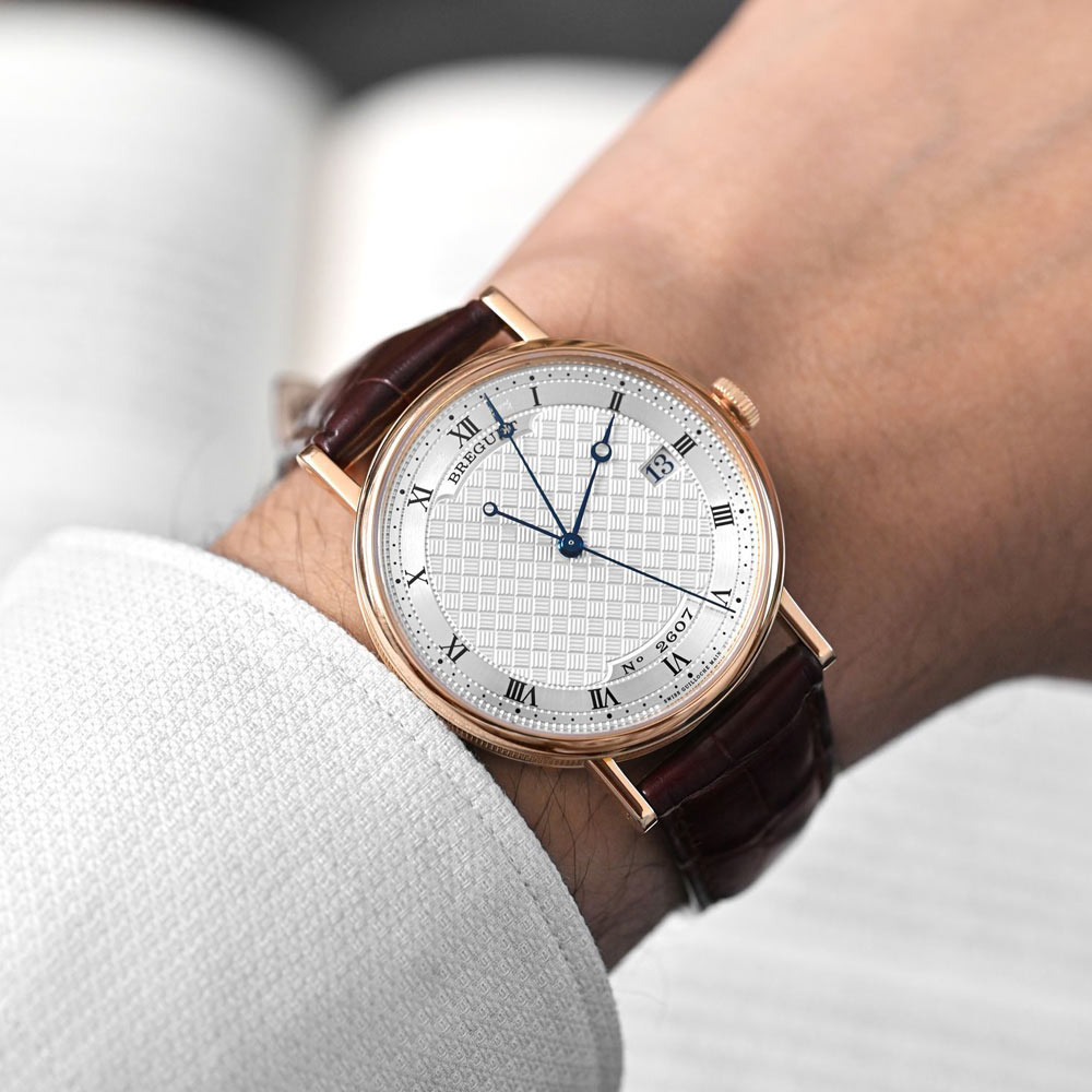 Als klare Kreation von Breguet weist dieses Modell alle Eigenschaften der Kollektion Classique auf: einen Gehäusemittelteil mit Kannelierung, einen transparenten Boden, geschweißte Armbandbefestigungen, ein Zifferblatt mit „Grand Feu“-Email oder Guillochierung sowie Breguet-Zeiger mit der charakteristischen Pomme-Spitze.