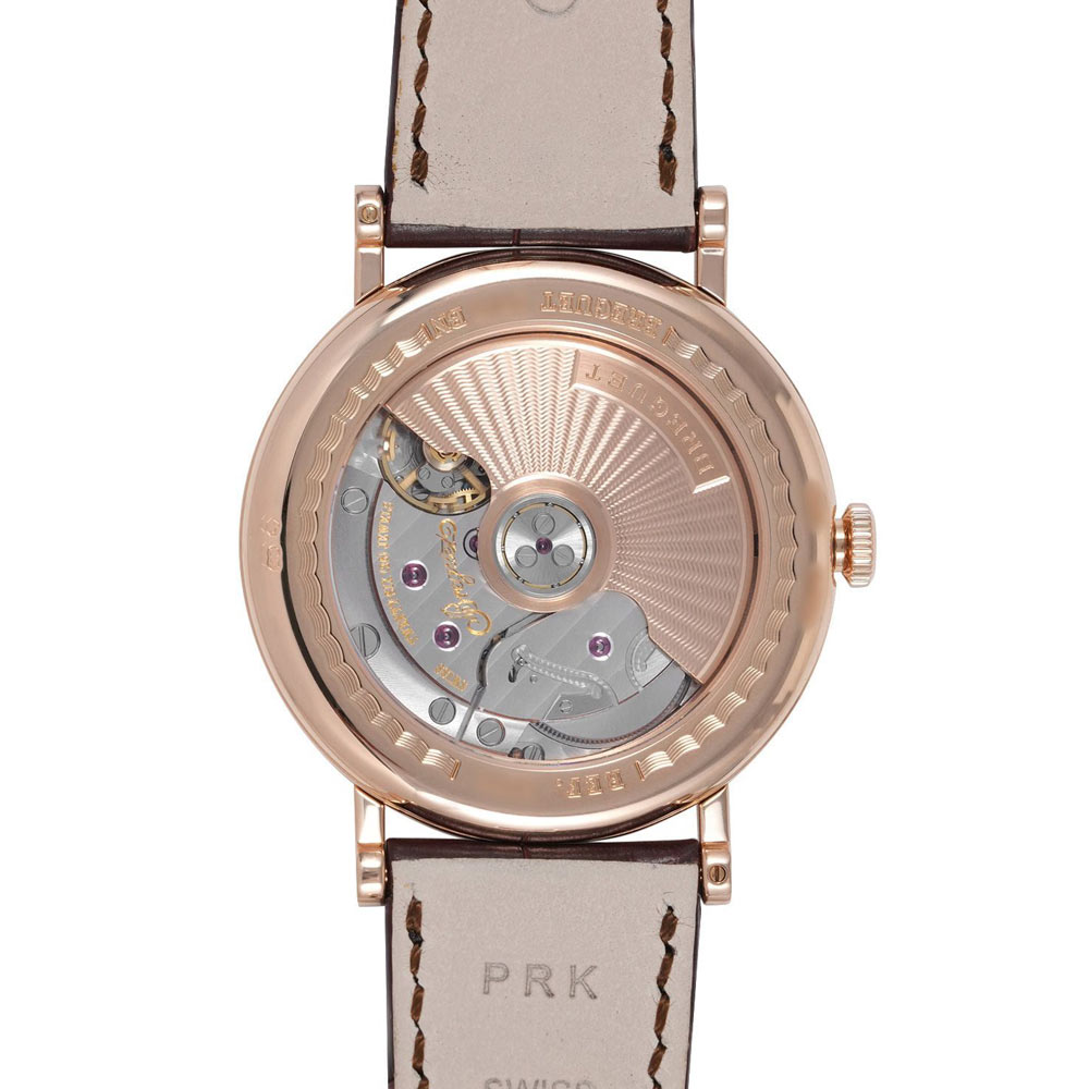 Wunderschöne Dress-Watch aus der Kollection Classique in 38 Millimetern Durchmesser mit mechanischem Selbstaufzug. Zifferblatt aus 18 Karat Gold, graviert und versilbert. Sichtboden mit Blick in das dekorierte Uhrwerk mit Goldrotor.