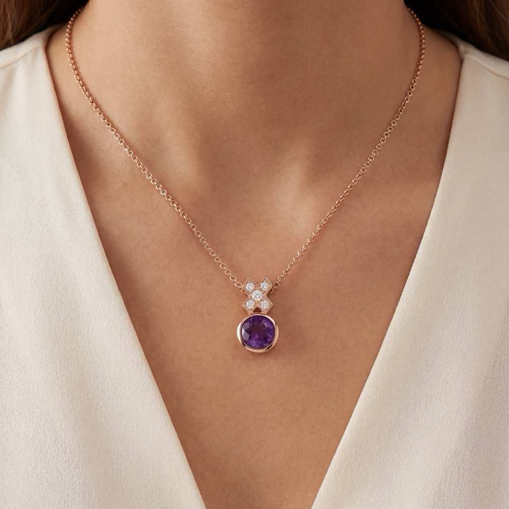 Moderner und zeitloser Anhänger mit einem violetten Amethyst und weißen Diamanten. An einer zarten Collierkette im Erbsmuster. In feiner Handarbeit in Roségold 750/- gearbeitet.